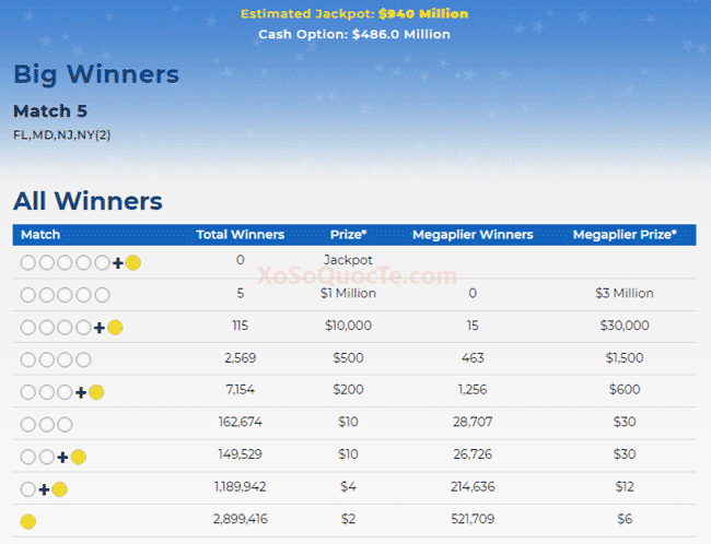 Giải Nhất đã đến với 5 người chơi. 5 người may mắn nhất mua vé từ bang Florida, Maryland, New Jersey, 2 New York trúng các giải $1,000,000.