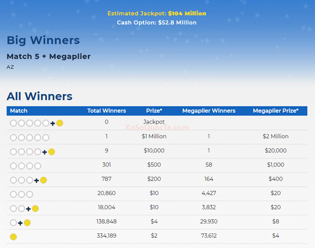 Trong phiên quay thưởng này, người chơi may mắn nhất mua vé tại bang Arizona và trúng thưởng $2,000,000 với quyền chọn Megaplier 2X.