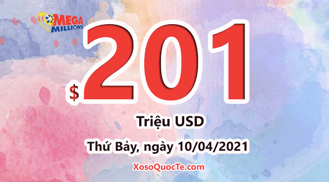 Jackpot của Mega Millions chạm tới mốc $201 triệu đô-la. Phiên quay thưởng sắp tới của Mega Millions sẽ diễn ra vào Thứ Bảy, ngày 10/04/2021 (giờ Việt Nam) tới đây.