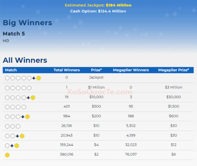 Tuy jackpot chưa có chủ, nhưng giải Nhất thì đã đến tay 1 người chơi (Maryland) – người sở hữu tấm vé trị giá $1 triệu đô-la.