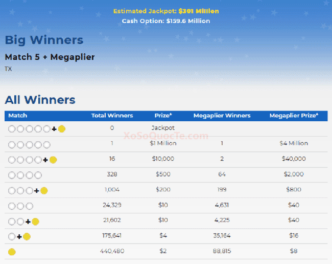 Jackpot chưa có chủ, nhưng trong phiên quay thưởng này có 1 giải Nhất $4 triệu đô-la thuộc về người chơi tới từ bang Texas với tấm vé có thêm quyền chọn Megaplier 4X.
