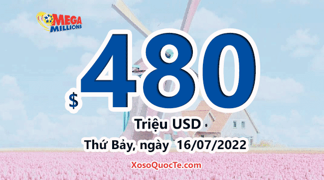Jackpot của Mega Millions chạm tới mốc $480 triệu đô-la. Phiên quay thưởng sắp tới của Mega Millions sẽ diễn ra vào Thứ Bảy, ngày 16/07/2022 (giờ Việt Nam) tới đây.