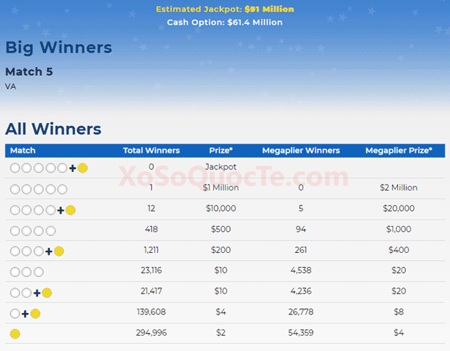 Trong phiên quay thưởng này, may mắn mỉm cười với rất nhiều người. 1 người chơi mua vé tại bang Virginia đã trúng $1 triệu đô-la. Có 12 người trúng giải Nhì, cụ thể, có 6 giải $10,000 đô-la, 5 giải $20,000 đô-la nhờ Megaplier 2X và 1 giải $15,294 cho ngời chơi tới từ California.