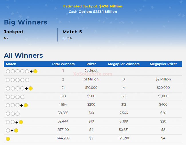 Bạn có thể theo dõi thông tin kết quả giải thưởng chi tiết trong bảng dưới đây.Jackpot có chủ lớn nhất trong lịch sử giải Mega Millions trị giá $1.537 tỷ USD trong phiên quay thưởng ngày 23/10/2018 (giờ Mỹ).