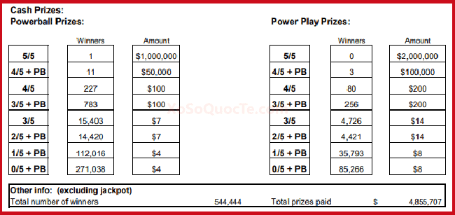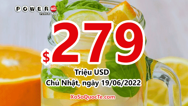 Một người chơi xổ số Powerball đã trúng giải 1 triệu đô-la. Phiên quay thưởng ngày 16/06/2022 (theo giờ Việt Nam) tiếp tục chưa tìm được người sở hữu tấm vé chứa cả 6 số may mắn. Giá trị jackpot của Powerball tăng mạnh lên mốc $279 triệu đô-la.