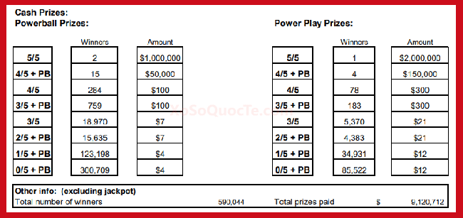 May mắn đem những giải Nhất trị giá “triệu đô” của Powerball tới với 3 người chơi. 2 người mua vé tại các bang Iowa và Wisconsin trúng các giải $1,000,000. Người chơi mua vé tại bang Kentucky cùng quyền chọn Power Play 3X trúng gấp ba được giải $2,000,000.