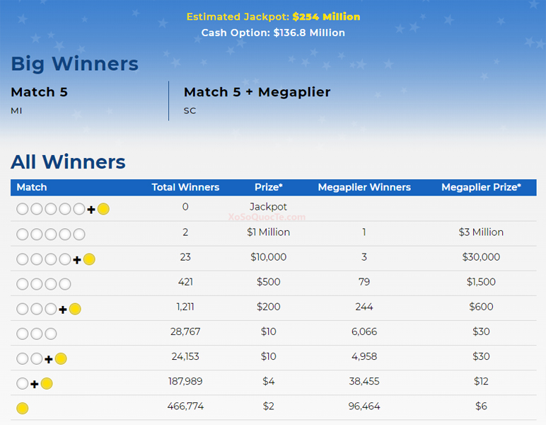Trong phiên quay thưởng này, có 2 giải Nhất. 1 người chơi Michigan trúng $1,000,000 và 1 người chơi South Carolina trúng $3,000,000 với tấm vé có thêm quyền chọn Megaplier 3X.