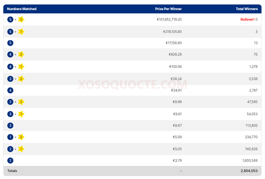 Euro Millions – siêu xổ số xuyên các quốc gia châu Âu vừa trao tới 3 giải Nhất cho phiên ngày 22/04/2023 (giờ Việt Nam). Hiện tại, giải này sở hữu jackpot có giá trị lớn bậc nhất thế giới với €112 triệu Euro.