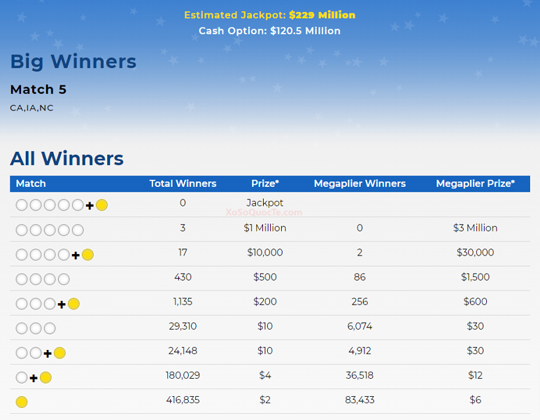 2 tấm vé trị giá $1 triệu đô-la đã đến với những người mua vé từ bang Iowa, North Carolina. 1 tấm vé được mua tại bang California trúng $2,296,629.