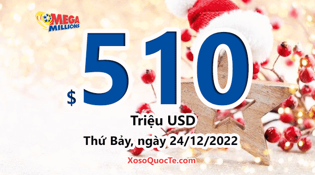 Jackpot của Mega Millions lên mốc $510 triệu đô-la. Phiên quay thưởng sắp tới của Mega Millions sẽ diễn ra vào Thứ Bảy, ngày 24/12/2022 (giờ Việt Nam) tới đây.