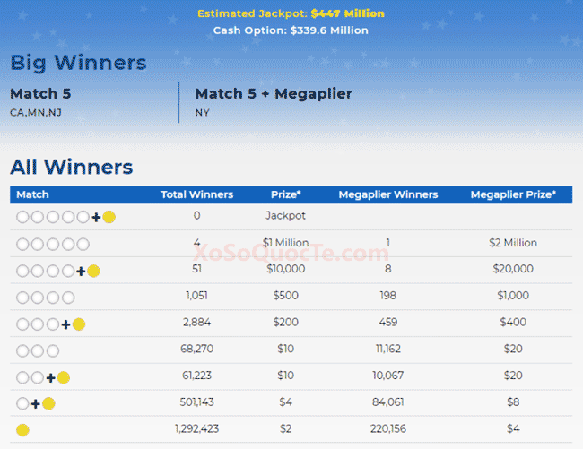 Thông tin chia sẻ trên blog này dành cho những bạn đọc yêu thích các giải thưởng xổ số quốc tế "nghìn tỷ" đang sinh sống tại các quốc gia cho phép dịch vụ mua hộ vé số quốc tế được phép hoạt động. Khi truy cập XoSoMy.com bạn đọc cần hiểu rằng thông tin trên website chỉ mang tính tham khảo từ những chia sẻ kinh nghiệm thực tiễn cá nhân của tác giả khi chơi xổ số quốc tế như Powerball, Mega Millions,...; Tác giả trang web XoSoMy.com không cung cấp dịch vụ mua hộ bất kỳ loại vé số quốc tế nào! Để mua vé số quốc tế bạn hãy tự chọn lựa cho mình một nhà cung cấp dịch vụ mua hộ đáng tin cậy trước khi tham gia cuộc chơi toàn cầu này!