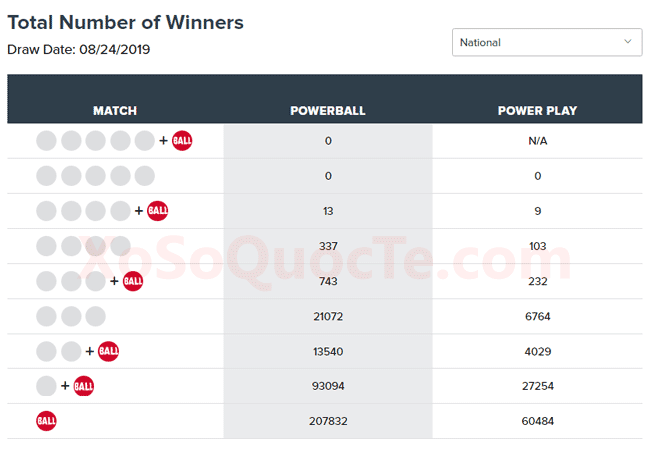 Phiên quay thưởng ngày 25/08/2019 của xổ số Powerball chưa ghi nhận có người chơi nào trúng giải triệu đô. Theo đó, jackpot của Powerball tiếp tục tăng lên $60 triệu USD.