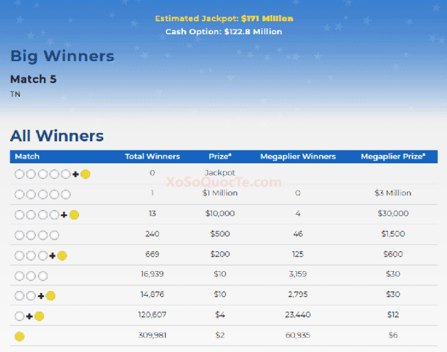 Một người chơi mua vé tại bang Tennessee đã trúng giải Nhất trị giá $1,000,000. Có tổng cộng 13 giải Nhì trong phiên quay thưởng này của Mega Millions, trong đó có 8 giải Nhì trị giá $10,0004 giải Nhì $30,000 nhờ ngôi sao may mắn Megaplier 3X; và 1 giải Nhì $18,331 (California). Cùng với đó là rất nhiều người may mắn khác nhận được những giải thưởng nhỏ hơn.