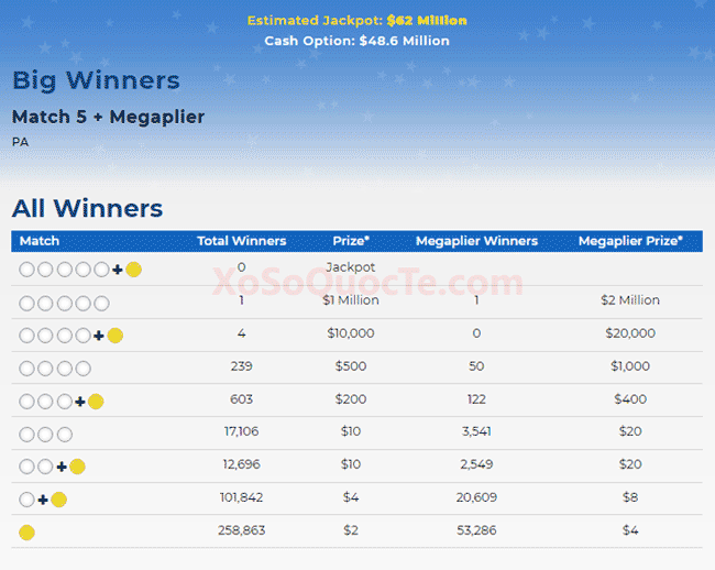 Một người chơi mua tấm vé tại Pennsylvania đã trúng giải thưởng rất lớn trị giá $2 triệu đô với Megaplier 2X. Cùng với người chơi này là 2 người trúng thưởng giải trị giá $10,000; 2 người trúng gấp đôi $20,000. Cùng với đó là nhiều giải thưởng nhỏ hơn khác.