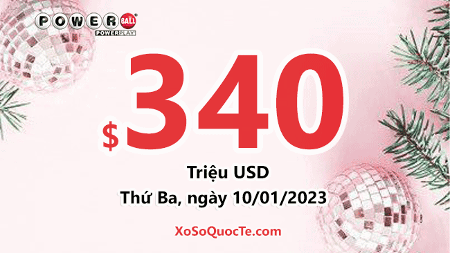 Theo thông tin chính thức từ hãng xổ số Powerball, phiên quay thưởng ngày 08/01/2023 (giờ Việt Nam) có 3 tấm vé trùng cả 5 số thường để nhận được các giải thưởng triệu đô. Mức thưởng cho phiên tiếp theo của Powerball tăng lên thành $340 triệu USD.