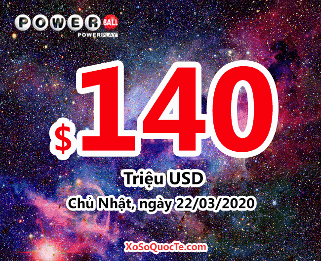 Jackpot xổ số tự chọn Powerball vừa tăng lên mức $140 triệu đô-la tương đương hơn 3,220 tỷ VNĐ sau phiên quay thưởng diễn ra ngày 19/03/2020 theo giờ Việt Nam. Sau nhiều phiên quay thưởng liền nhau, giải jackpot của Powerball vẫn chưa tìm thấy chủ nhân.