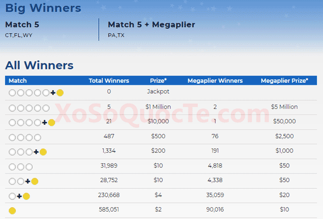 Năm người chơi thắng giải Nhất xổ số Mega Millions. Trong đó, có 3 người (Connecticut, Florida, Wyoming) nhận được phần thưởng $1 triệu USD và có tới 2 người (Pennsylvania và Texas) trúng gấp 5 lần giá trị giải thưởng và nhận được $5 triệu đô-la nhờ có Megaplier 5X. Cùng với đó là rất nhiều giải khác, có 21 người nhận giải Nhì từ xổ số Mega Millions. Cụ thể, có 15 người nhận được $10.000 đô-la tương đương hơn 230 triệu VNĐ; 1 người khác nhận được $50.000 đô-la nhờ có Megaplier 5X và 5 người California nhận được $6,853 theo quy định của bang này.