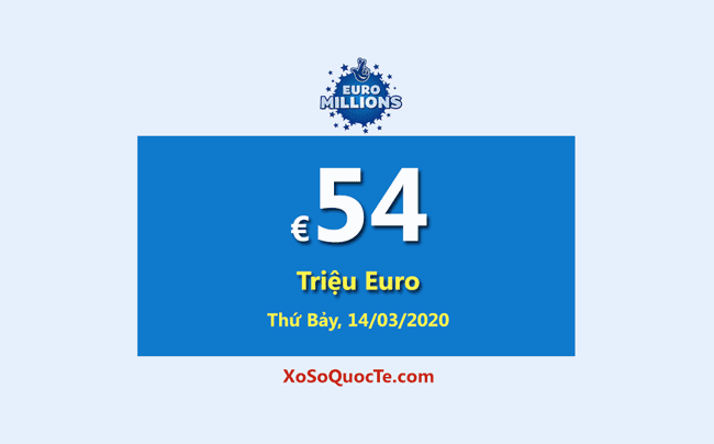 Giải thưởng Jackpot cho lần quay số kế tiếp của xổ số Euro Millions sẽ diễn ra vào Thứ Bảy, ngày 14 tháng 03 năm 2020 (giờ Việt Nam) là €54 triệu Euro tương đương hơn 1404 tỷ VNĐ.