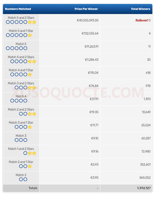 Phiên quay thưởng ngày 11/03/2020 tìm thấy 4 người may mắn trúng Giải Nhì khi sở hữu những tấm vé có 5 cặp số trùng với 5 cặp số trong kết quả xổ số Euro Millions và 1 số Lucky Stars. Mỗi người chơi này nhận được phần thưởng trị giá €132,535.64 Euro (tương đương hơn 3.4 tỷ đồng). Cùng với đó, có nhiều giải thưởng khác được trao như thông tin trong bảng dưới đây.