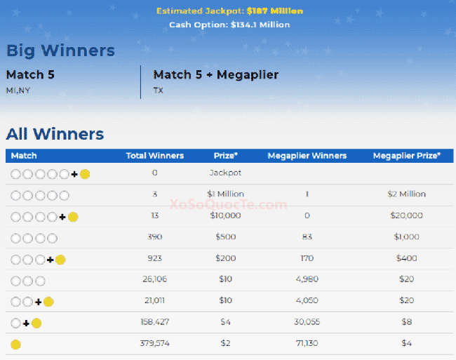 Giá trị giải thưởng của Mega Millions sẽ tăng dần sau mỗi phiên quay thưởng không tìm được chủ nhân jackpot. Ai sẽ là người chiến thắng jackpot $201 triệu đô-la của phiên kế tiếp? Đừng quên phiên quay thưởng kế tiếp của xổ số Mega Millions sẽ diễn ra vào Thứ Tư, ngày 29 tháng 12 năm 2021 (theo giờ Việt Nam) bạn nhé!