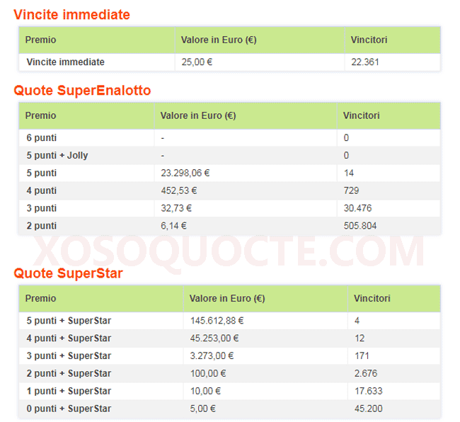 Trong phiên quay thưởng ngày 27/07/2019 (giờ Ý), có tới 4 người trúng giải Nhất 145.612,88 € tương đương hơn 3.78 tỷ VNĐ với những tấm vé trùng 5/6 số thường và SuperStar. Các giải Nhì đã được trao cho 14 người sở hữu những tấm vé trùng 5/6 số thường trị giá 23.298,06 € và 12 người mua được những tấm vé trùng 4/6 số thường và số SuperStar và trúng 45.253,00 €. Bên cạnh đó là nhiều giải khác như dưới đây.