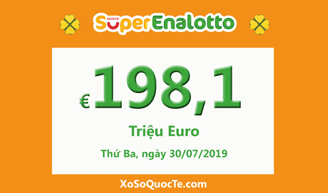 Giải jackpot của SuperEnalotto đang là 198.100.000 € tương đương hơn 5150 tỷ đồng. Phiên quay thưởng sẽ diễn ra vào Thứ Ba, ngày 30/07/2019.