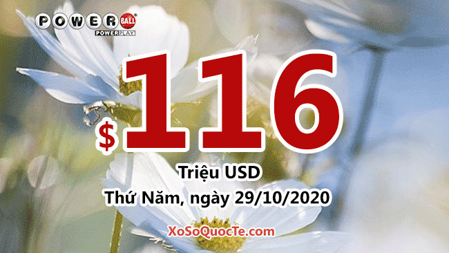 Mức jackpot cho phiên quay thưởng sắp tới của xổ số Powerball là $116 triệu USD với phiên quay thưởng diễn ra vào Thứ Năm, ngày 29 tháng 10 năm 2020 (theo giờ Việt Nam).