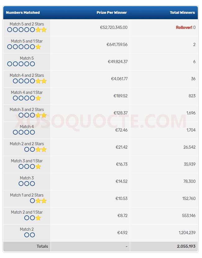 Phiên quay thưởng ngày 01/01/2020 này đã tìm thấy 2 người chơi trúng Giải Nhất €641,759.56 Euro (tương đương hơn 16.6 tỷ đồng). Cùng với đó có 6 người may mắn trúng Giải Nhì €49,824.37 Euro khi sở hữu các tấm vé có 5 cặp số trùng với 5 cặp số trong kết quả xổ số Euro Millions và bị sai 2 số Lucky Stars. Euro Millions cũng trao nhiều giải thưởng nhỏ hơn khác như thông tin trong bảng trên đây.