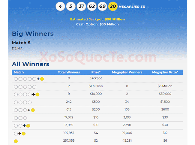 Trong phiên quay thưởng này, Megaplier 3X đã xuất hiện, đem cơ hội nhân giá trị giải thưởng cho người chơi lên 3 lần. Dù chưa có ai trúng jackpot nhưng giải Nhất thì đã có chủ, 2 người may mắn này đến từ bang Delaware và bang Massachusetts. Mỗi người nhận được $1 triệu đô-la khi tấm vé của họ trùng 5 số trên những trái bóng trắng là 4 – 5 – 31 – 62 – 69. Bên cạnh đó là 6 giải Nhì với $10.000 đô-la (tương đương hơn 220 triệu VNĐ); 1 giải Nhì $14.617 đô-la (từ bang California) của 7 tấm vé trùng 4/5 số trên những trái bóng trắng và số 20 trên trái bóng vàng Mega Millions. Megaplier 3X cũng đem giải $30.000 đô-la tới cho 2 người may mắn khác.