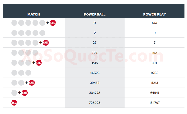 Con số 06 của phiên trước lại một lần nữa xuất hiện trong phiên quay thưởng này của xổ số Powerball, đem tới phần thưởng $1 triệu đô-la cho 2 người chơi tới từ hai bang Indiana và Maryland. Ngoài ra là 30 người đạt giải Nhì và rất nhiều giải nhỏ hơn. Với 25 người nhận được $50.000 đô-la (tương đương 1,1 tỷ VNĐ) và 5 người may mắn hơn nhận được $150.000 đô-la nhờ vào Power Play 3X giúp nhân 3 lần giá trị giải thưởng.