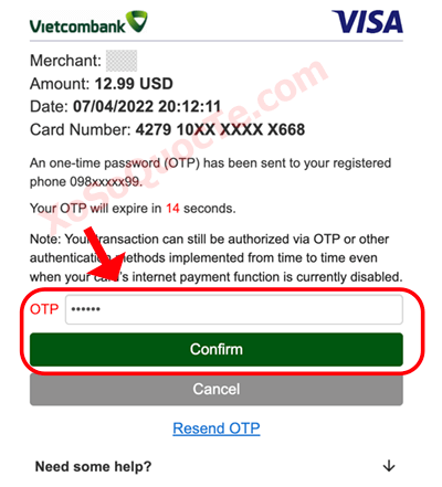 Sau đó nhập mã số bạn nhận được qua tin nhắn SMS (Hoặc Email) vào ô OTP rồi bấm nút “Confirm” để thực hiện giao dịch: