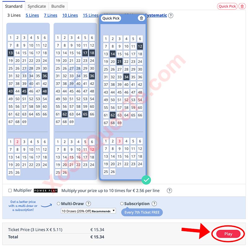 Bước 2: Chọn các dãy số may mắn của bạn ! Tại đây bạn sẽ thấy có 3 tấm vé yêu cầu bạn chọn số. Trên mỗi tấm vé bạn sẽ chọn 6 con số (5 số bình thường và một số may mắn màu đỏ). Bạn có thể chọn thủ công từng số trên mỗi tấm vé hoặc bấm vào QUICK PICK để máy tính chọn ngẫu nhiên cho bạn.