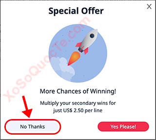 Lúc này theLotter sẽ hỏi bạn có muốn đăng ký thêm tuỳ chọn Ngôi Sao May Mắn POWER PLAY (hoặc dịch vụ cộng thêm nào đó khác) hay không? bạn có thể chọn câu trả lời “NO THANKS” hoặc “YES PLEASE!” tuỳ vào nhu cầu của bạn: