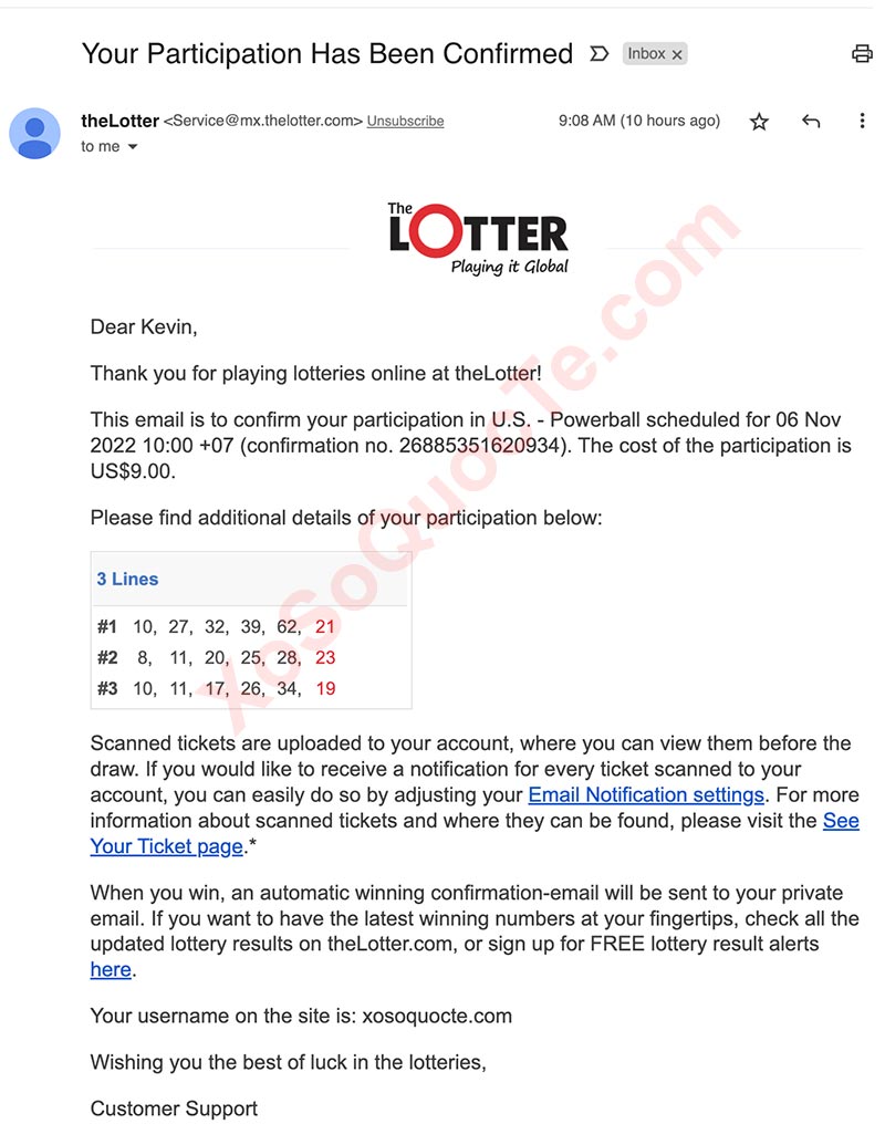 Cũng ngay lúc này, một email cung cấp đầy đủ thông tin chi tiết xác nhận rằng bạn đã đặt mua trực tuyến tấm vé gồm các dãy số Powerball thông qua TheLotter được gửi đến email của bạn, chứng minh quyền sở hữu của bạn: