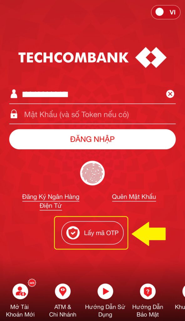 Bạn mở app của ngân hàng Techcombank trên điện thoại. Bấm chọn “Lấy mã OTP“: