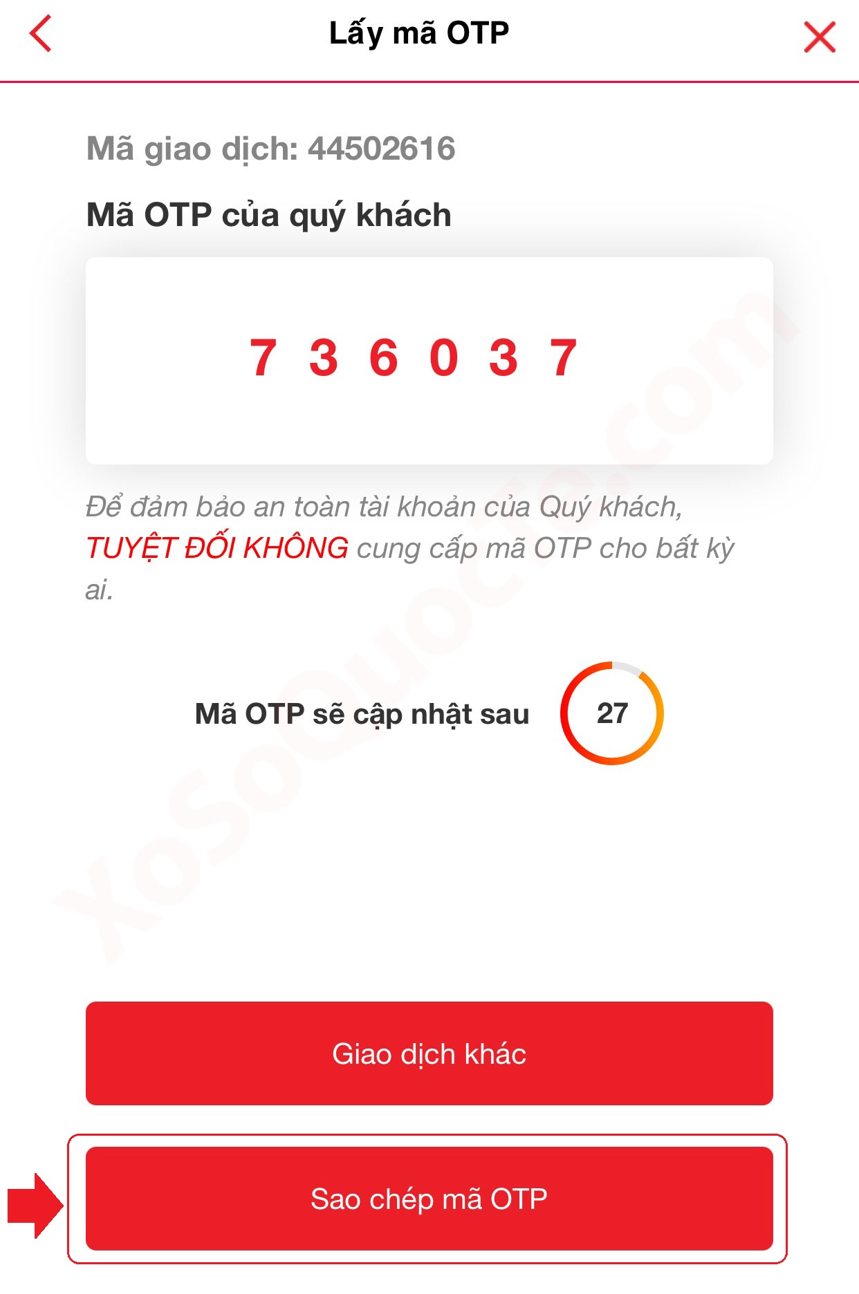 Mã OTP cần cho thanh toán vé số đã hiển thị. Bạn nhấn “Sao chép mã OTP” hoặc ghi nhớ lại chuỗi 6 chữ số này: