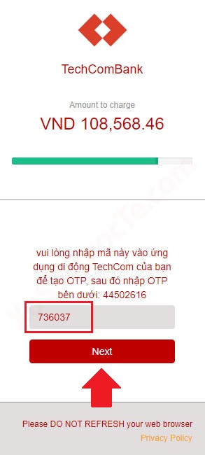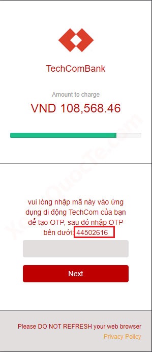 Một mã OTP sẽ hiện ra như bên dưới. Bạn cần sử dụng mã này để tạo mã OTP thanh toán qua app của ngân hàng Techcombank: