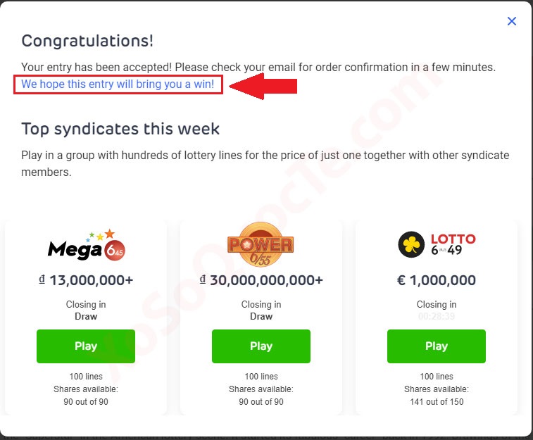 Bạn sẽ nhận được thông báo chúc mừng đặt mua vé số thành công từ LottoAgent. Tại đây, bạn có thể bấm vào “We hope this entry will bring you a win!” để vào xem thông tin chi tiết cho tấm vé số của mình: