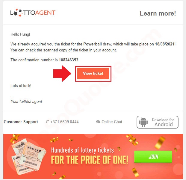 Quan sát bạn sẽ thấy Tiêu đề email trên ghi “Your ticket is purchased!” – nghĩa là “Tấm vé của bạn đã được mua!“. Lúc này bạn mở nội dung mail ra, bấm vào nút “View ticket” để xem thông tin và bản SCAN tấm vé may mắn của bạn: