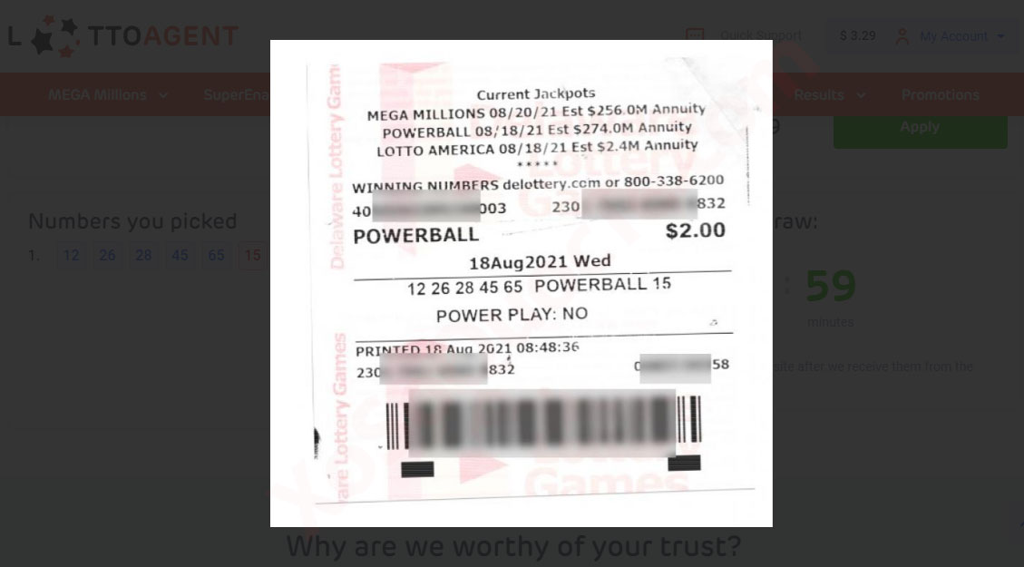 Lotto Agent là nhà cung cấp dịch vụ mua hộ nổi tiếng chỉ sau theLotter. Cũng giống TheLotter, Lotto Agent cung cấp bản Scan tấm vé vật lý nên đảm bảo quyền sở hữu tấm vé thật cho người chơi. Ngoài ra Lotto Agent có một ưu điểm đó là cho phép bạn mua duy nhất một tấm vé số (1 dãy số) trong một lần mua, giúp bạn cảm thấy an tâm thử vận may “nghìn tỷ” trong điều kiện tài chính giới hạn!