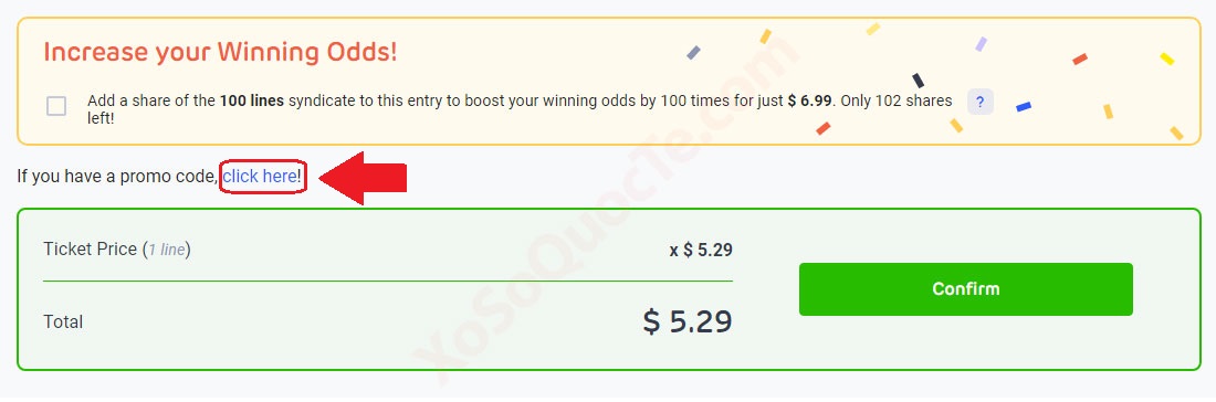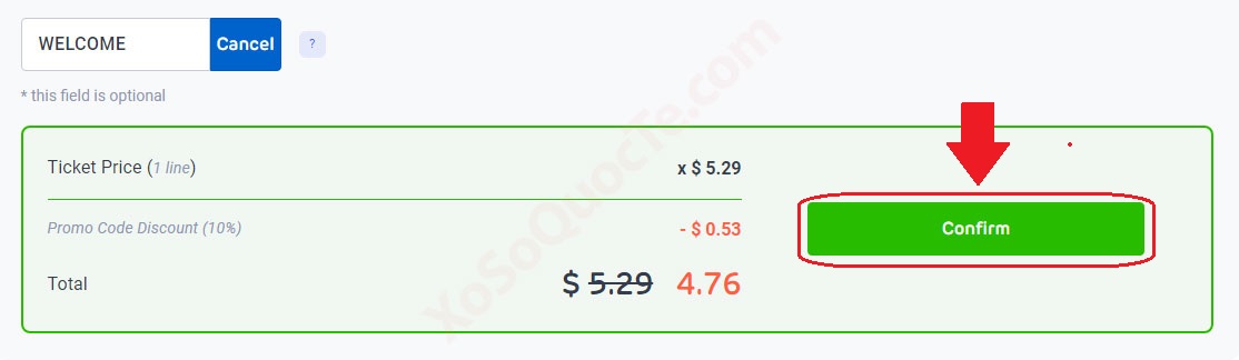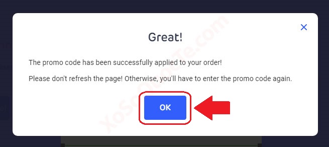Mã giảm giá cho lần mua vé số đầu tiên được áp thành công, hãy bấm nút OK.