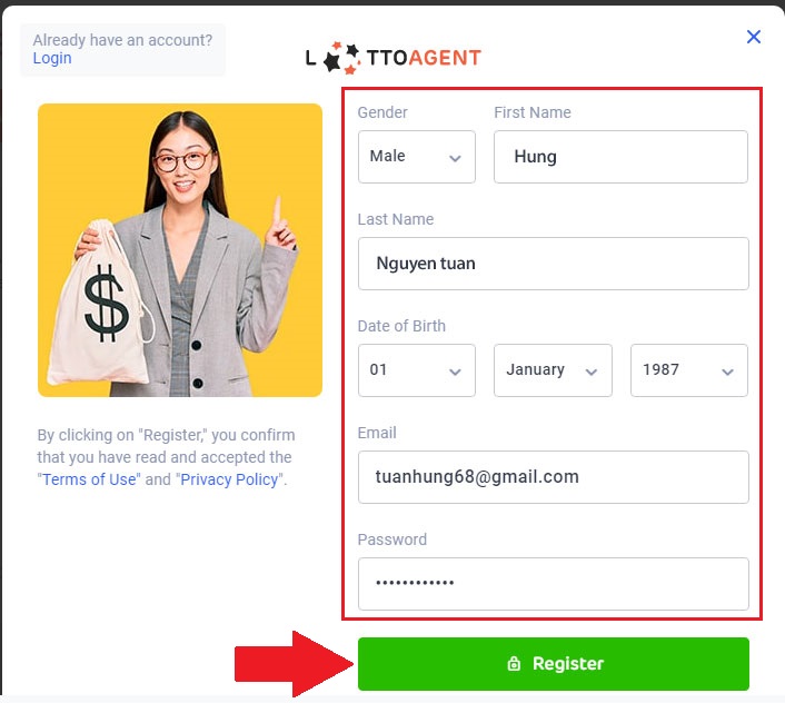 - Password: Điền một mật khẩu dễ nhớ để đăng nhập vào Lotto Agent trong tương lai.
