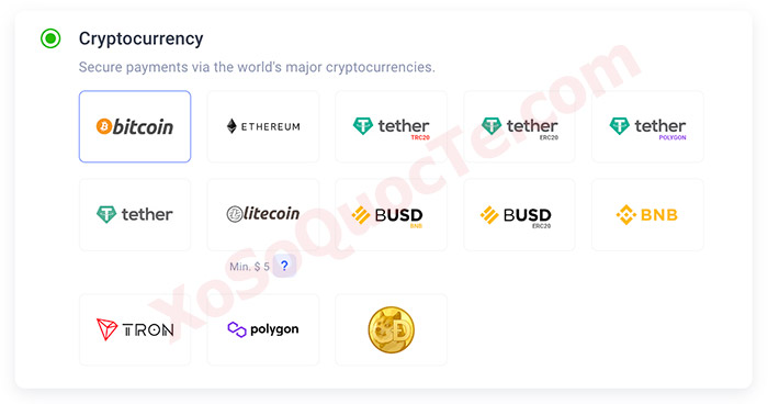 Ở tuỳ chọn Cryptocurrency, LottoAgent hỗ trợ nhiều loại tiền điện tử thông dụng: