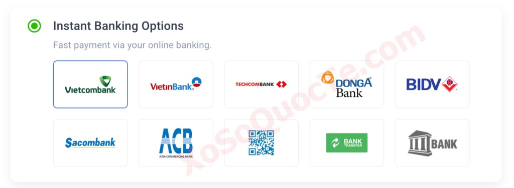 Nhà cung cấp dịch vụ mua hộ LottoAgent cung cấp cho bạn nhiều tuỳ chọn thanh toán để lựa chọn, chẳng hạn ở tuỳ chọn Instant Banking Options (tuỳ chọn Internet Banking) bạn sẽ thấy có nhiều ngân hàng để bạn lựa chọn thanh toán: