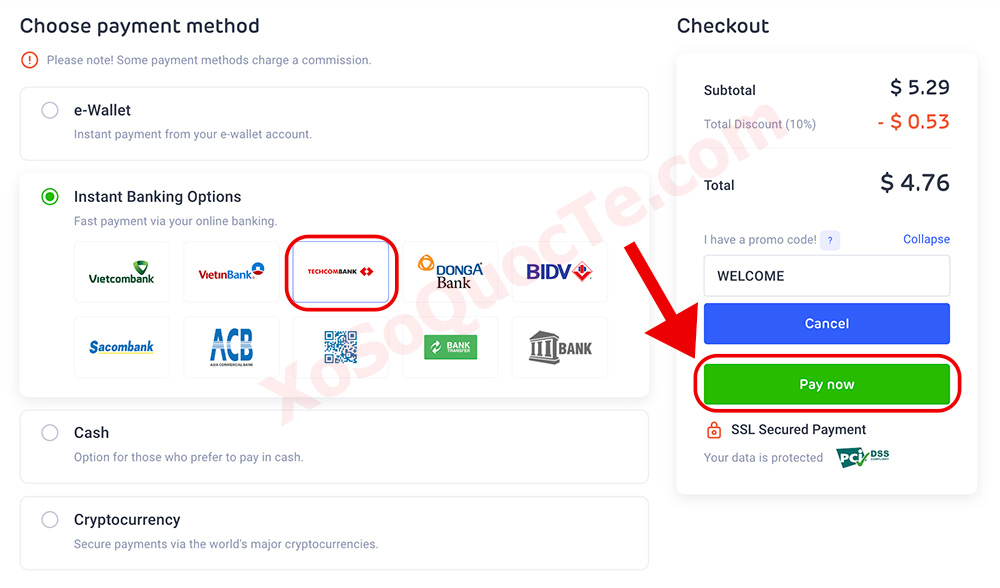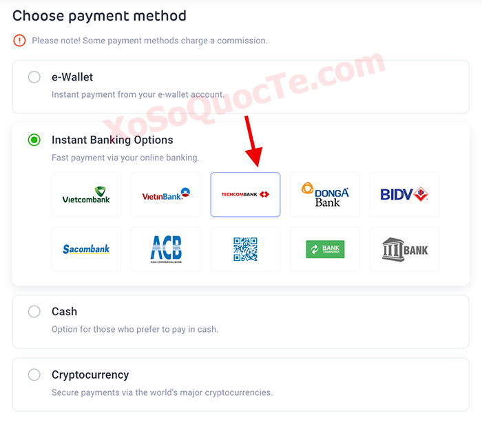 Để thanh toán bằng tài khoản ngân hàng Techcombank thì bạn chọn phương thức thanh toán là Instant Banking Options: TECHCOMBANK.