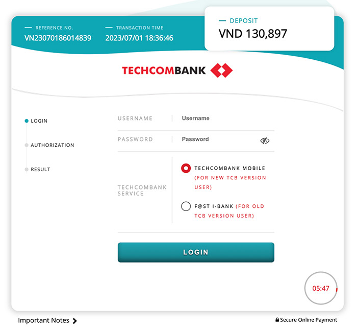 Quá trình xử lý được tiếp tục. Cổng xử lý thanh toán quốc tế hiện ra với số tiền thanh toán cụ thể (hệ thống chỉ xử lý với số tiền này do đó bạn hãy yên tâm sử dụng). Hãy nhập Tên đăng nhập và Mật khẩu tài khoản ngân hàng Techcombank (hoặc ngân hàng khác tuỳ lựa chọn Ngân hàng ban đầu) của bạn. Sau đó bấm LOGIN: