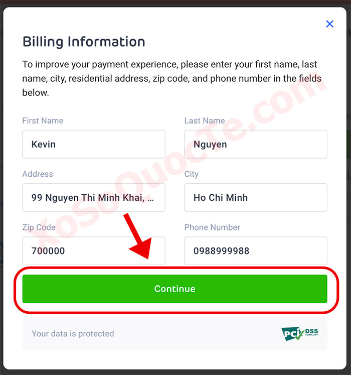 Nếu xuất hiện yêu cầu cung cấp thông tin hoá đơn, bạn điền đầy đủ thông tin rồi bấm nút Continue: