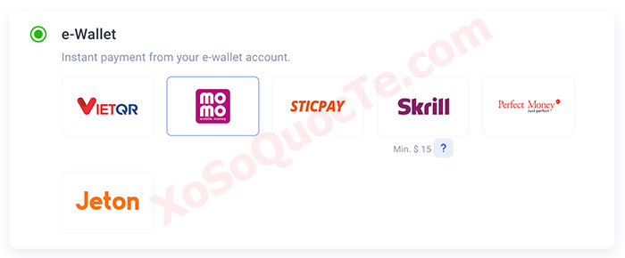 Ở tuỳ chọn e-Wallet, Lotto Agent hỗ trợ thanh toán bằng các ví thông dụng như MOMO, VietQR, Skrill, Perfect Money,…: