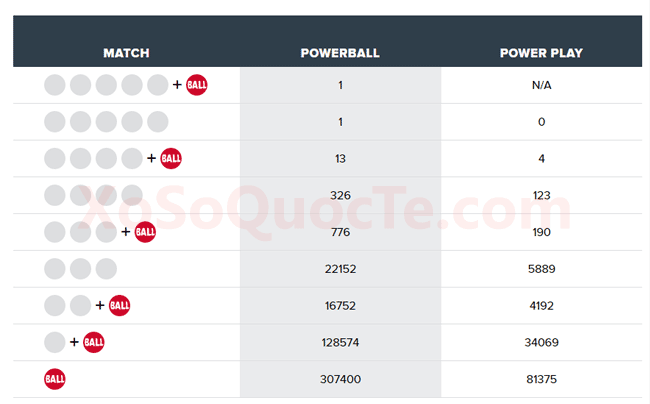 Người may mắn nhất trúng jackpot 150 triệu đô-la của Powerball đã mua tấm vé của mình tại bang California. Cùng với đó, phiên quay thưởng lần này còn ghi nhận có 1 người chơi mua vé từ bang Virginia trúng $1,000,000 đô la và 17 người trúng Giải Nhì nhờ sở hữu những tấm vé có 4 cặp số trùng với 4/5 cặp số của kết quả xổ số Powerball và con số Powerball màu đỏ. Cụ thể, 10 người nhận được giải thưởng mỗi giải trị giá $50,000; 4 người còn lại nhận được giải thưởng mỗi giải trị giá $100,000 nhờ sở hữu thêm tùy chọn Ngôi Sao May Mắn – PowerPlay 2X và 3 người tới từ California nhận được $12,970 đô-la. Ngoài ra là rất nhiều giải thưởng nhỏ hơn khác.