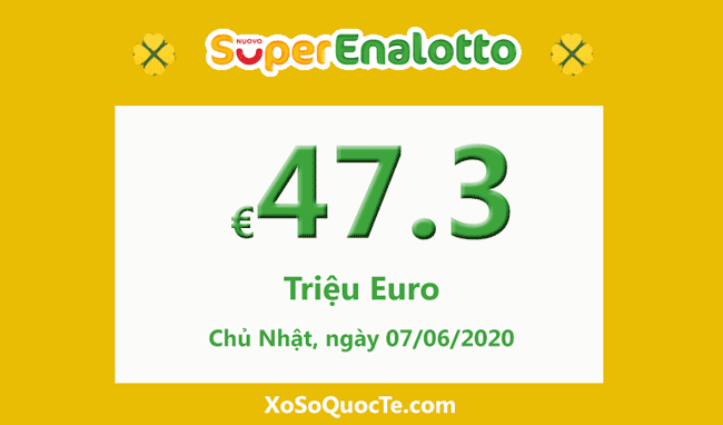Giải jackpot của SuperEnalotto đã tăng tiếp lên €47,300,000 tương đương hơn 1229 tỷ đồng. Phiên quay thưởng sẽ diễn ra vào Chủ Nhật, ngày 07/06/2020 – giờ Việt Nam.
